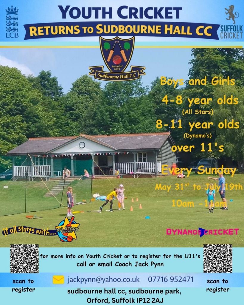 Sudbourne Hall Cricket Club is a community club based nestled between the villages of Sudbourne and Orford at picturesque Sudbourne Park.Established in 1893, the club runs a Saturday league team, a T20 mid week team and provides junior coaching through the ECB All Stars and Dynamos programme. We are also keen to establish Ladies cricket and are always on the look out for new players.